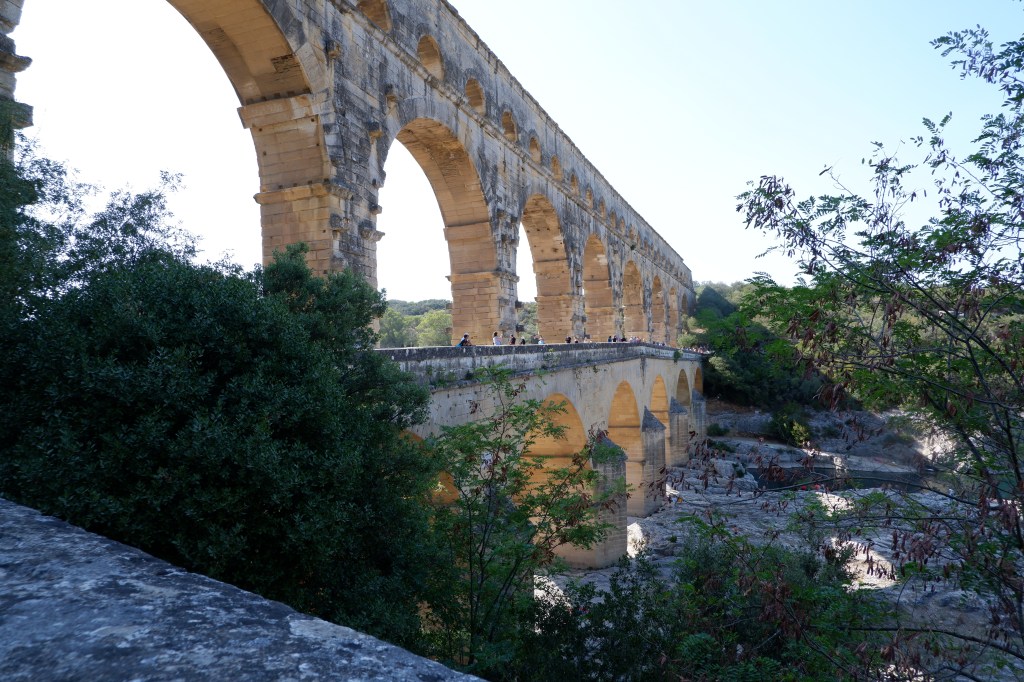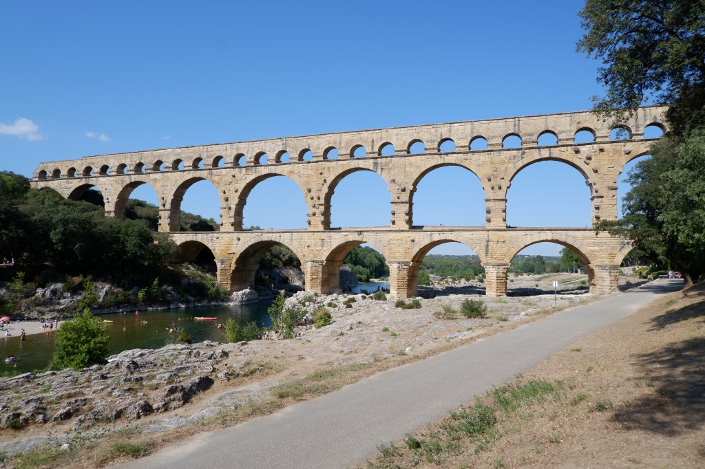 There was a Modern Art museum nearby that I’d hoped to visit. Musee Granet houses some wonderful works of Rembrandt and Renoir as well as numerous Impressionist works, most notably Cézanne . Google Maps indicated it was about 3 kilometres away, so we decided to go by car. As we later discovered, it was actually only about half a kilometre from us! But once back in the car, using the navigation to guide us, we were funnelled into progressively narrower and narrower streets, edged by bollards on one side and awkwardly parked cars on the other! Then, arriving at a spiderweb of intersecting streets, with the navigation lady commanding, “turn left now!” while impatient drivers were tooting at us and gesturing it was a ONE WAY street! We had no option but to give up! As soon as we could find a place to pull off to the roadside (there are almost none!) we re-set the navigation to take us to the Pont du Gard. At 50 m in height, this aqueduct is the tallest remaining Roman ruin in the world.
