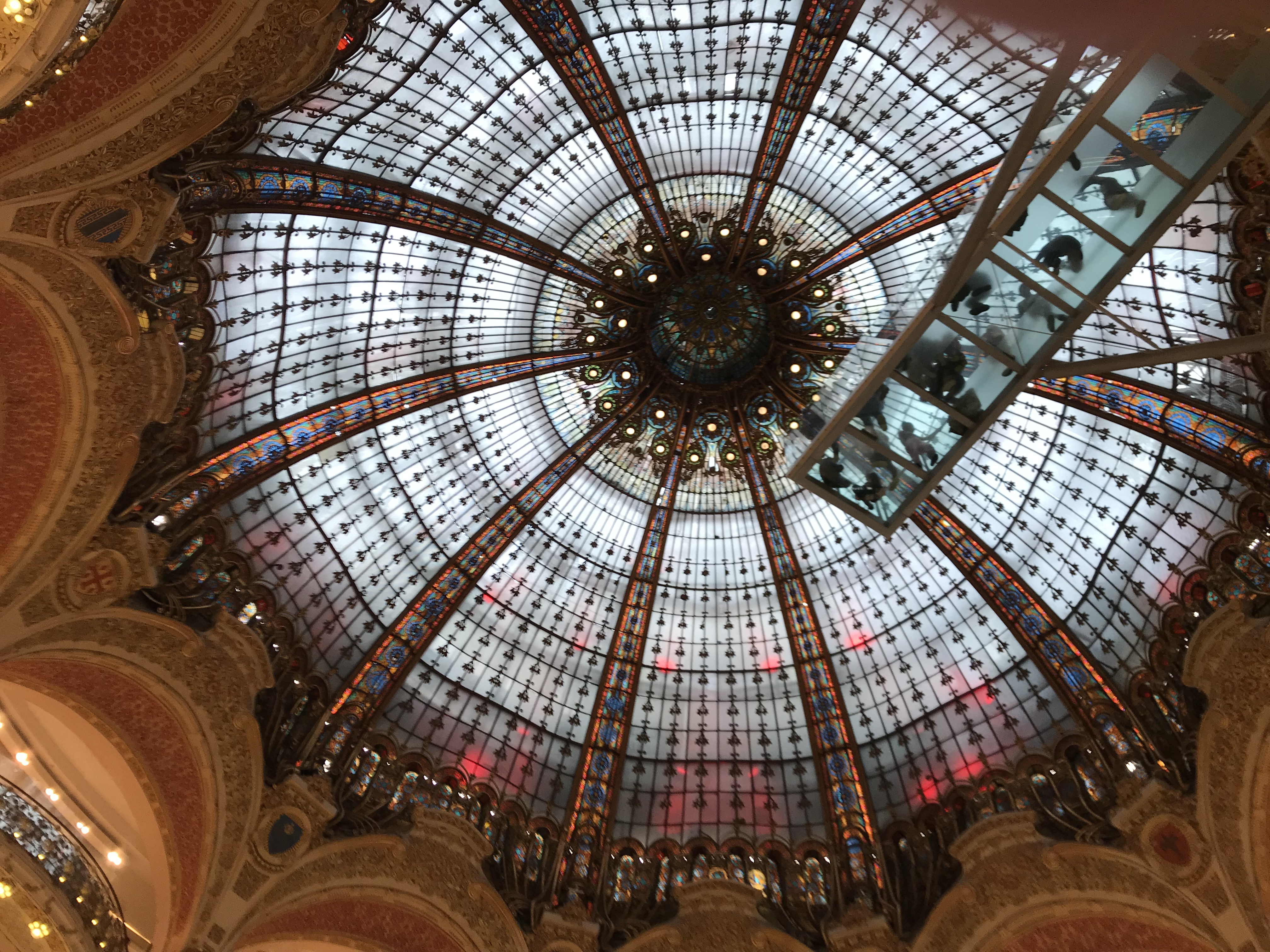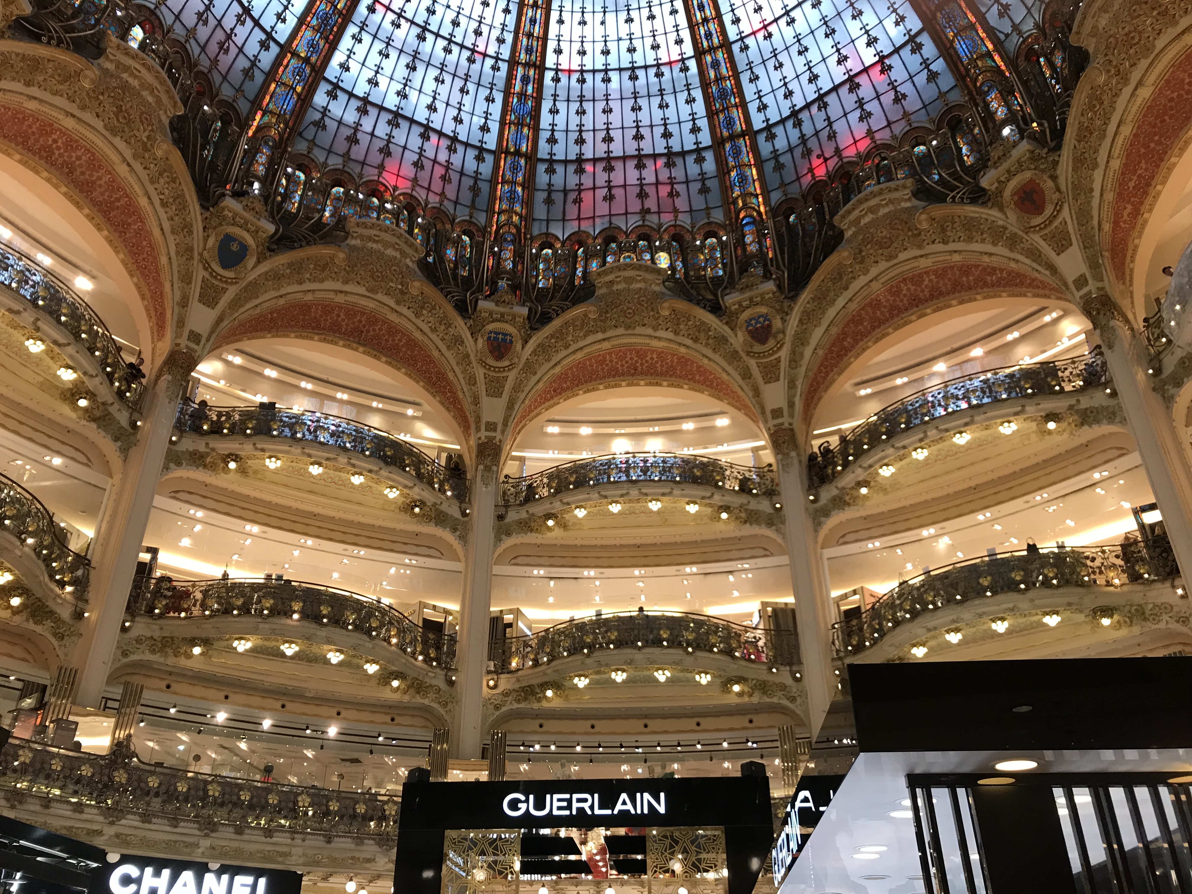 The amazing stained glass ceiling of Galleries Lafayette Tourists resting on the stairs of the glamorous department storeThe balconies of the Department store
