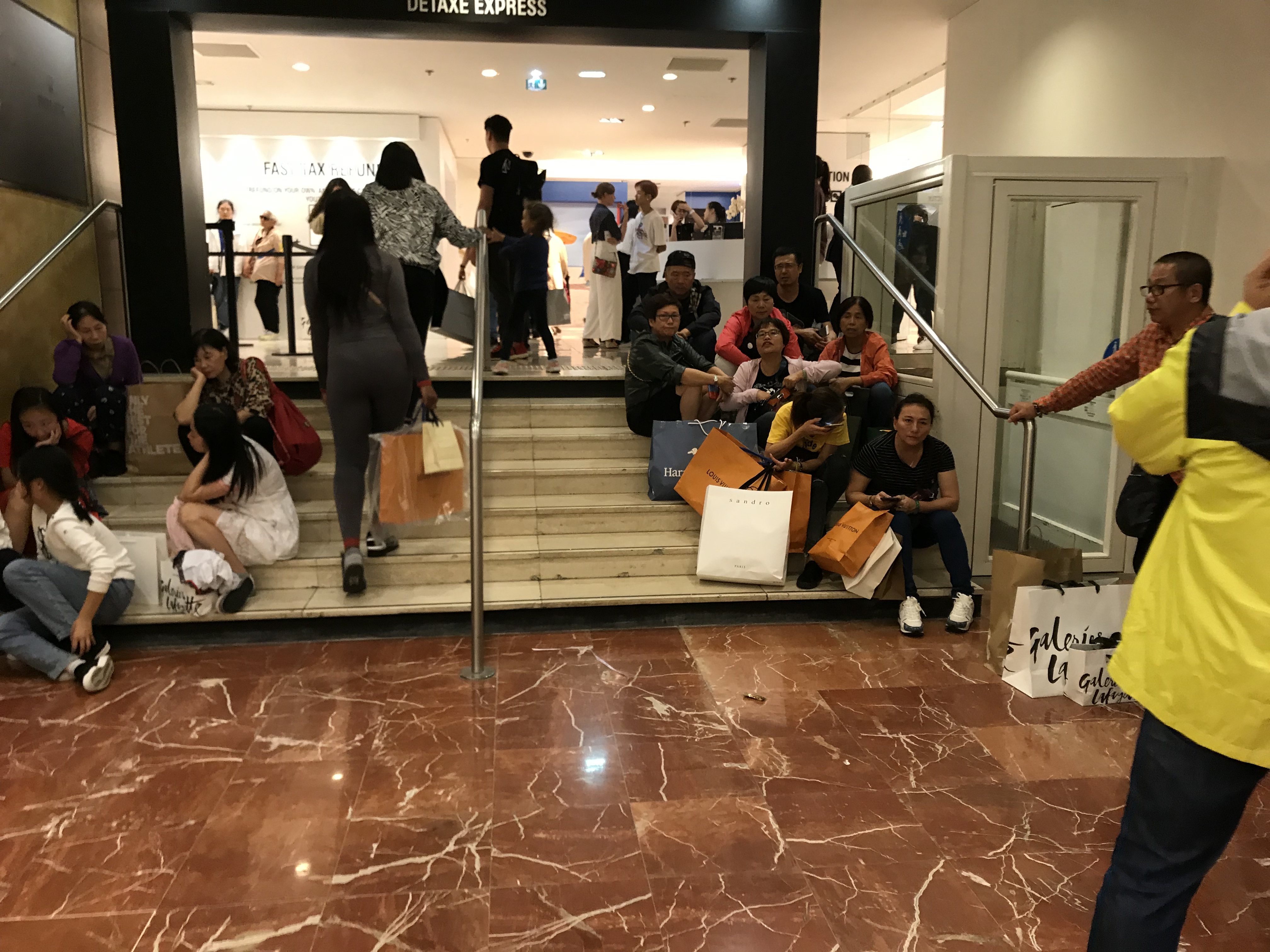 I wanted to claim my duty free entitlement rather than be troubled with the tedious exercise at departure in the airport. I’m sure that Gallérie Lafayette greatly increases their custom by offering this service. I had noticed so many Chinese tourists lining up to get into the serious name brand departments for handbags and other luxury items, but now, clearly exhausted and waiting for their special tour busses to retrieve them, they just flopped with their bags wherever they could find a spot, usually in stairways.