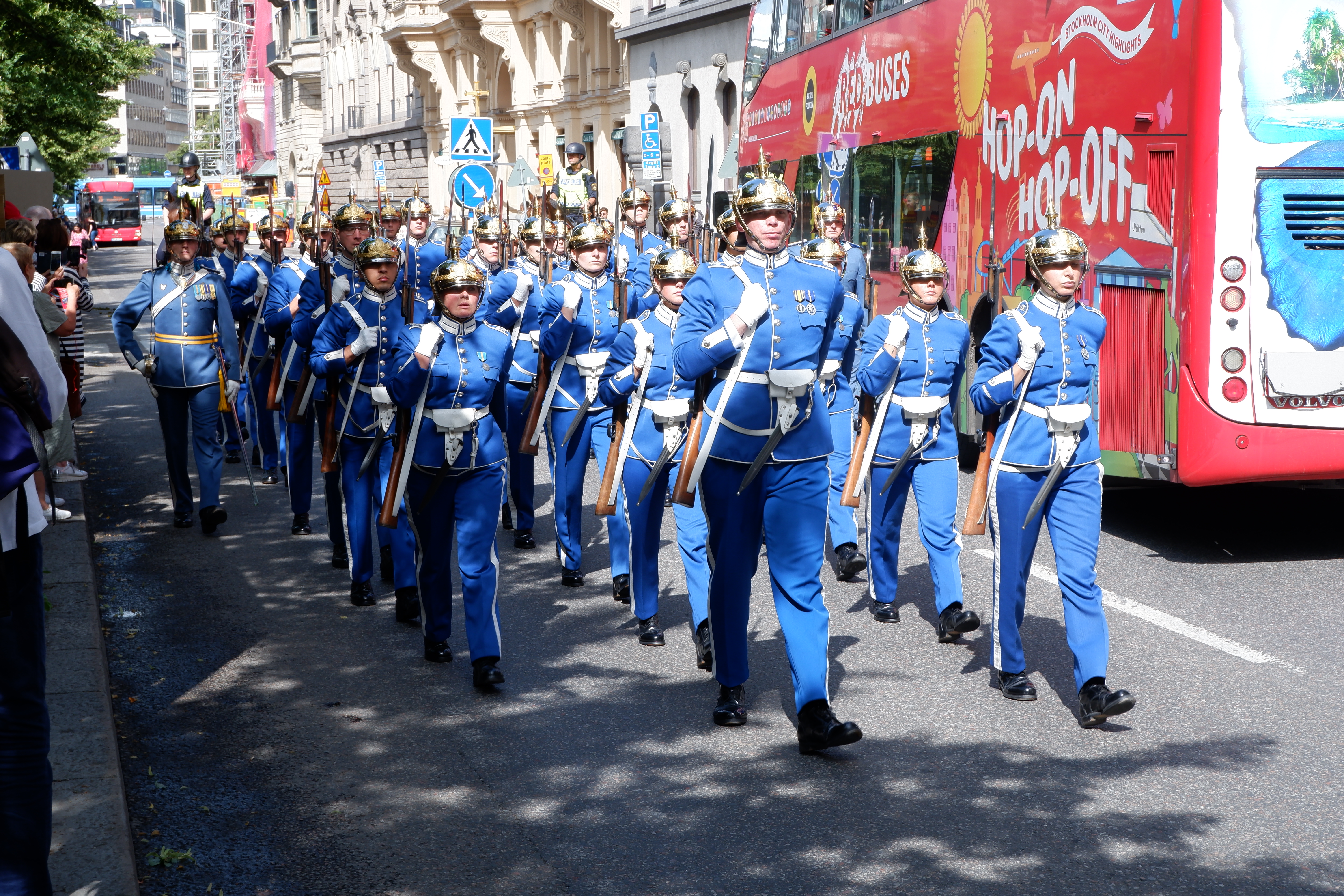 Our next objective was to find the Nordisk department store. However that required us to backtrack all the way to Gamla Stan then, just as far again, across a bridge, over on the other side! When we returned to the old town, the air was filled with very nearly as many selfie sticks as there were people on the ground! We threaded our way through the throng until we found our way to Nordisk. On the way, as we walked along a wide tree-lined walking precinct, we heard a marching military band approaching. Despite the opportunistic obstruction of a Hop-on-Hop-off bus partly blocking their path, the band masterfully marched past, followed by a large troop of soldiers in striking bright blue uniforms, wearing highly polished silver pickle-helms with gold badges and trims.