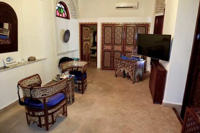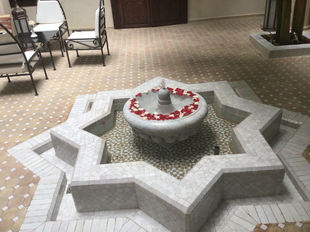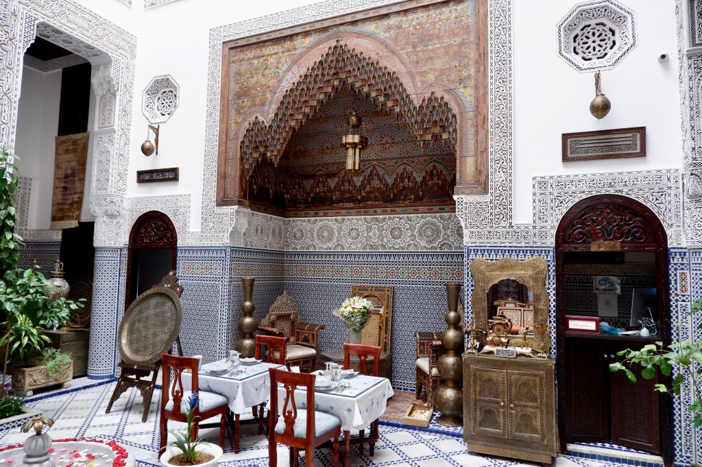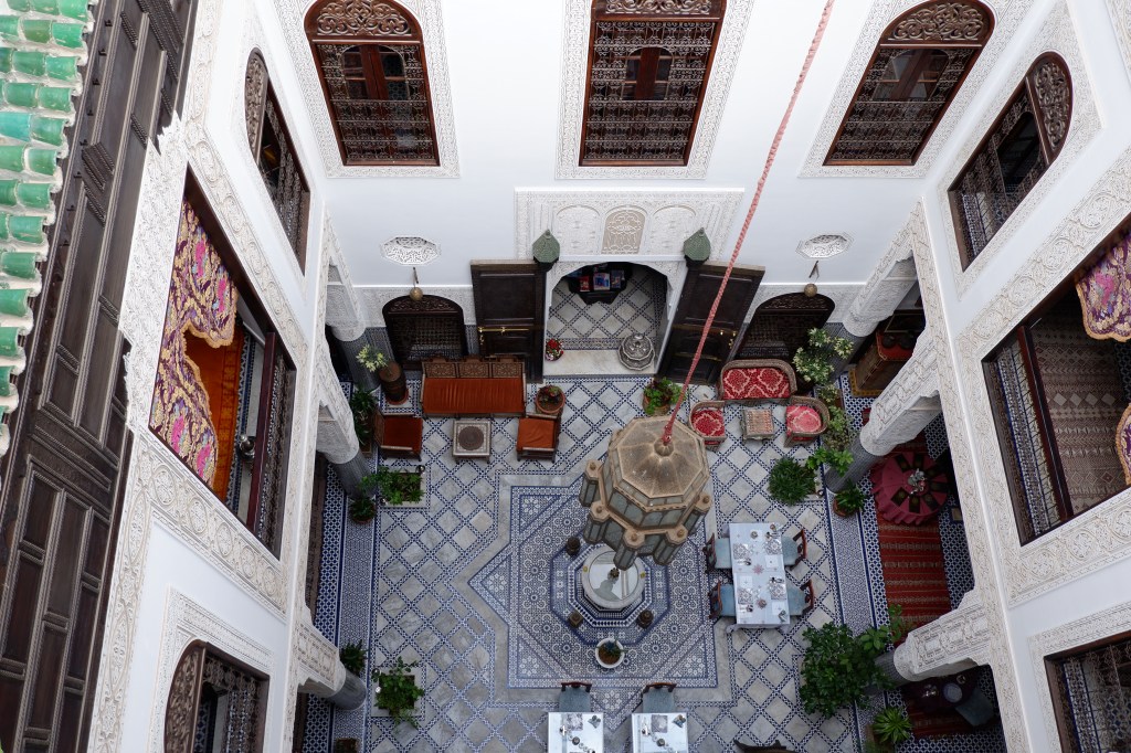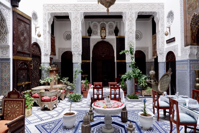 After the bustle of Marrakech, Fes (previously I had always presumed it was spelled ‘Fez’) felt instantly soothing. Although clearly much larger and with a higher population than Marrakech, it seems to be more spread out. Once again, we are in the Medina, behind the walls in the old town. Our Riad Fes Maya is absolutely glorious with the typical open courtyard giving the only access to the outside world (the high up stained glass windows are never opened to the outside world) and rising up over three floor to the rooftop. Once a palace, the ornate mosaics and hand chiselled cedar wood is complimented by brass fittings, stained glass and hand woven rugs. There are only nine rooms in total, so it feels very intimate. The tables and chairs in our room are made of inlaid mother-of-pearl and the heavy doors and shutters on the windows are of carved cedar. Even the black marble sink in our bathroom sink is embedded with ammonites and other fossils. Barry keeps marvelling at the extraordinary craftsmanship of the hinged doors and windows, the hand-crafted wrought screens and bolster rails. It is all over-the-top but it is absolute paradise!