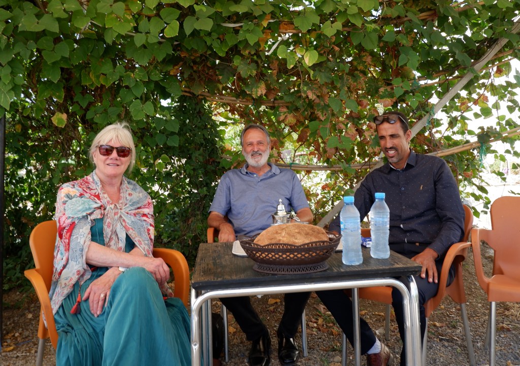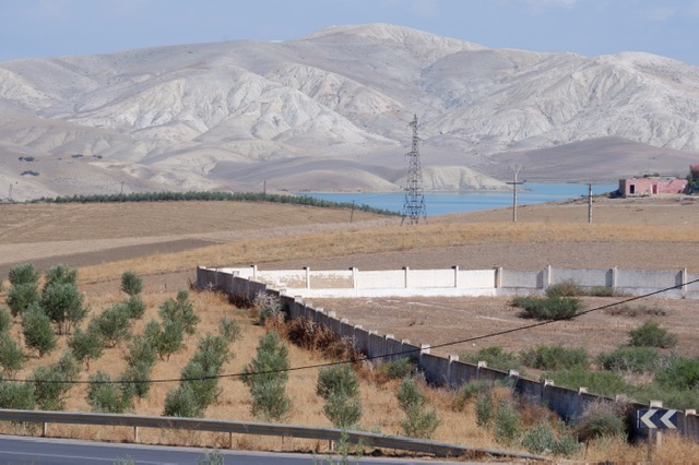 After our one day of rest, the next tour we had booked with Ibrahim was to Meknes Volubilus and Moulay Idris. Fortunately our departure time was 10 am. So we were able to have a more relaxed breakfast. Ibrahim was waiting when we came down. The distance was much shorter that to Chefchouen, but in the same general direction. We settled in for the drive. At about halfway. We stopped for a break at a small family road house. We sat outside in a shady covered area and were served mint tea and a freshly baked loaf of coarse bread. The mountains in the distance, above a azure blue lake, were strikingly white, as if covers with snow. We took some photos and resumed our journey to Volubilus.