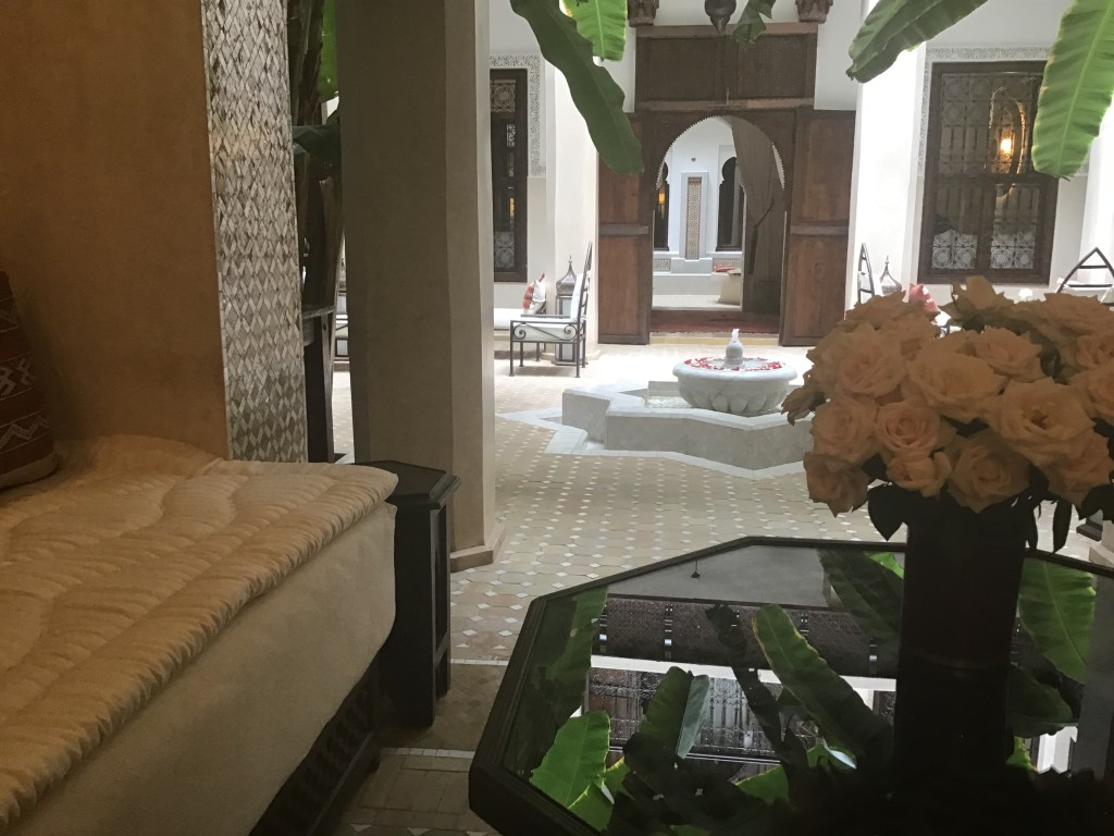 Back at the Riad, we had our appointment at the Hammam booked for 5 pm. There was just time to relax for a while with a lemonade in the downstairs Marjolis (lounge). We asked how we should be attired for the Hammam ritual. That was just to be in our robe and slippers, wearing only underpants. The Hammam room was warm, not hot, with a tiled floor and walls with low marble benches for us to lie on, at right angles to each other. We expected that I would have a woman and Barry would be attended by a man. But we were met at the door by a stocky attractive woman. We were each told to sit down on the benches. Then, unexpectedly, a bucket of hot water was tipped over each of us in turn. We were each soaped, scrubbed and sluiced repeatedly with warm water. Then came the (painful) salt scrub with a coarse scouring mit as an effective exfoliant. It’s a wonder we had any skin left! We were then smeared all over with a black clay rub. Then we relaxed, flat on the warm hard marble … until the next bucket of warm flushing water flooded over us!