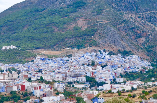 The trip was a gruelling four hours. We drove higher and higher into the mountains. When Chefchouen was only about 15 minutes away, according to Ibrahim, we came to the outskirts of a small village on its market day. Ibrahim explained that in this remote area, people came from as far as 7 kilometres away (!) on foot or on donkeys to sell their produce and buy their necessary supplies. However, that didn’t prepare us for the traffic snarl that ensued! We crawled through the village at a snail pace, stopping frequently. Out the other side, we climbed into the mountains. At a clear vantage point, Ibrahim pulled over to allow us our first glimpse of Chefchouen, clinging to the mountain side. Interestingly, while we expected a panorama of blue, the town was essentially whitewashed, dotted here and there with blue houses. Once inside the Medina of Chefchouen, it was a very different story. We walked down a series of winding, narrow lanes. Within those streets, one house after another was painted in a variety of shades of blue. Admittedly, once again, we became slightly disoriented (lost) making our way back to the main square.