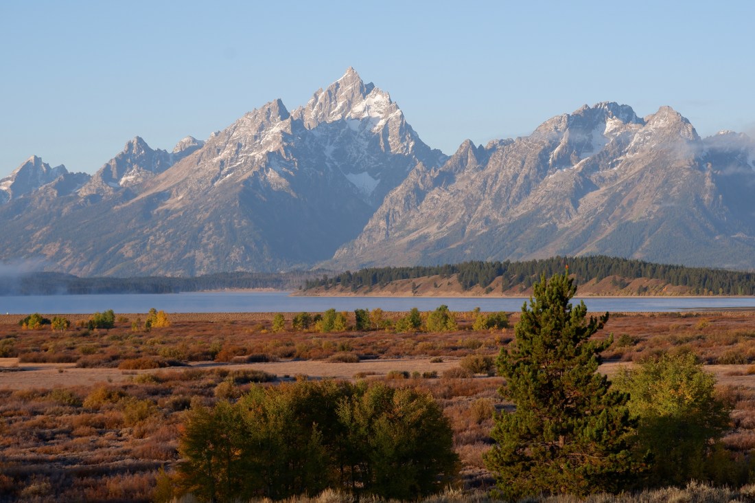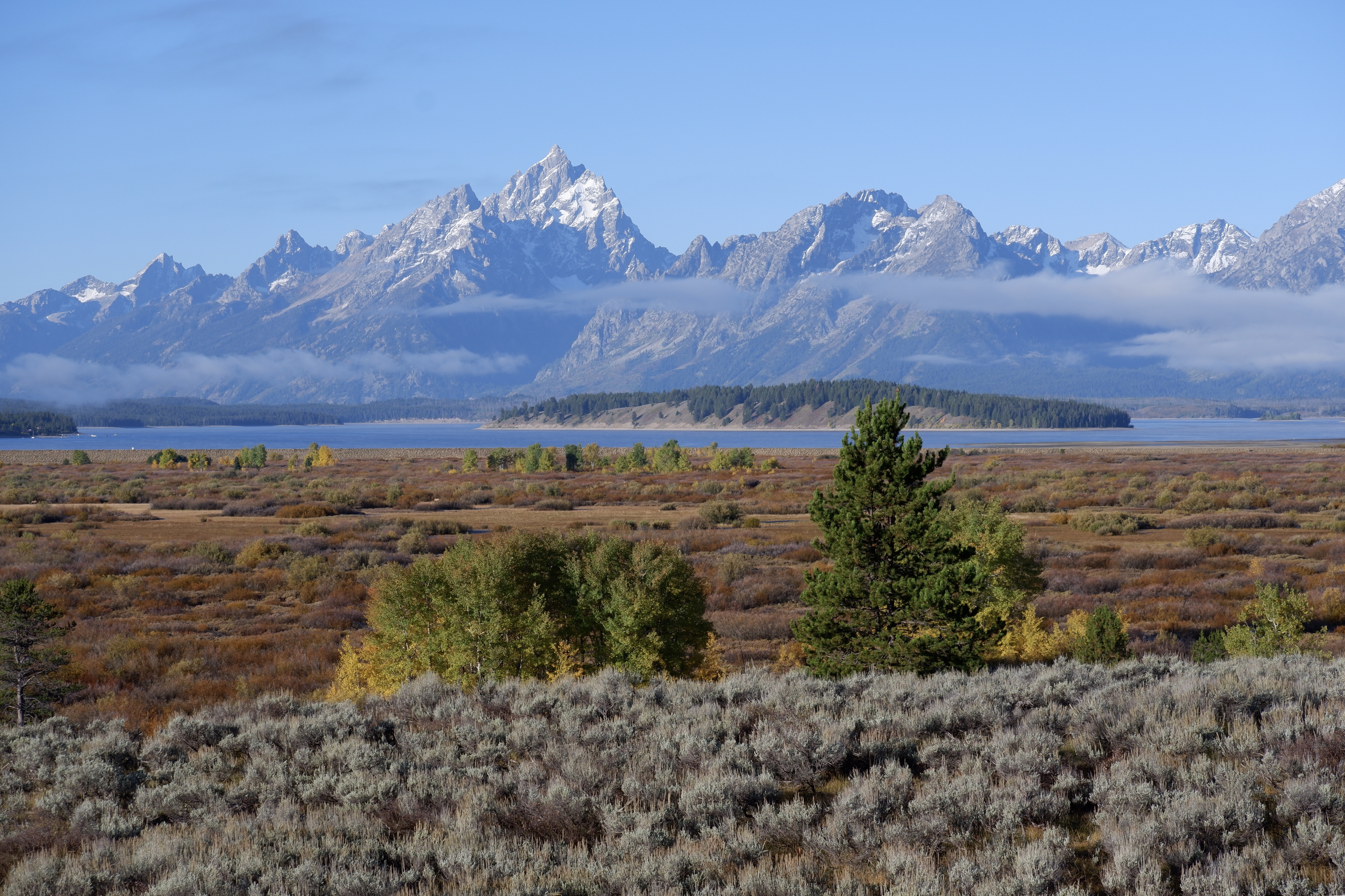We arrived at Jackson Lake Lodge at about 4.30 pm. It comprised the historic, large, lodge style hotel, with a number of successive, outlying additions in the form of single and double storey ‘cottages’. After checking in, we made our way to room 909, on the top floor of two at the outer edge of the development. The view from our room was magnificent. It looked out over an expanse of wetland, stretching into the distance to a glistening blue lake at the foot of the incredible rugged snow capped peaks of the Teton range of glnacier carved mountains! It was breathtaking to have such an outlook.