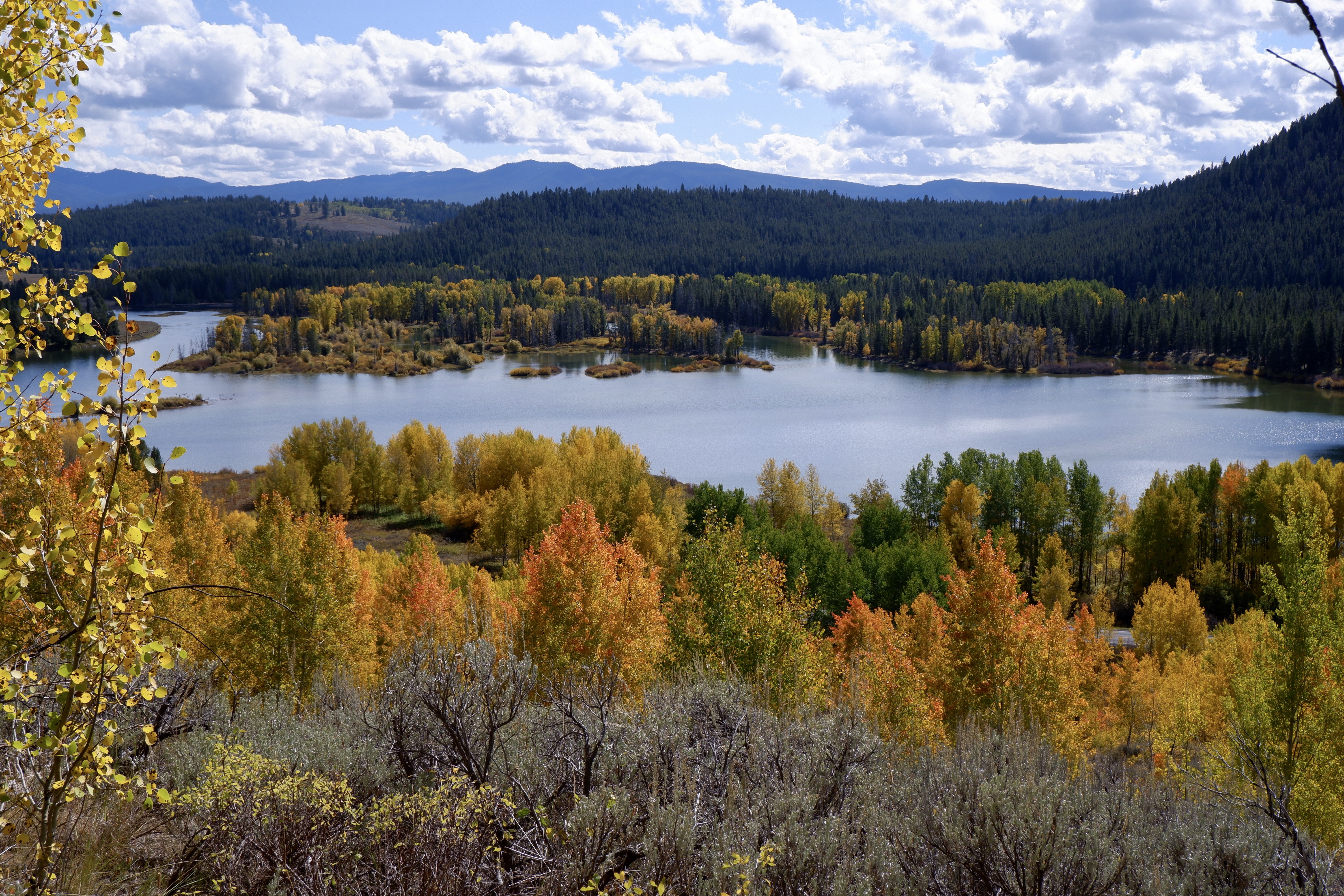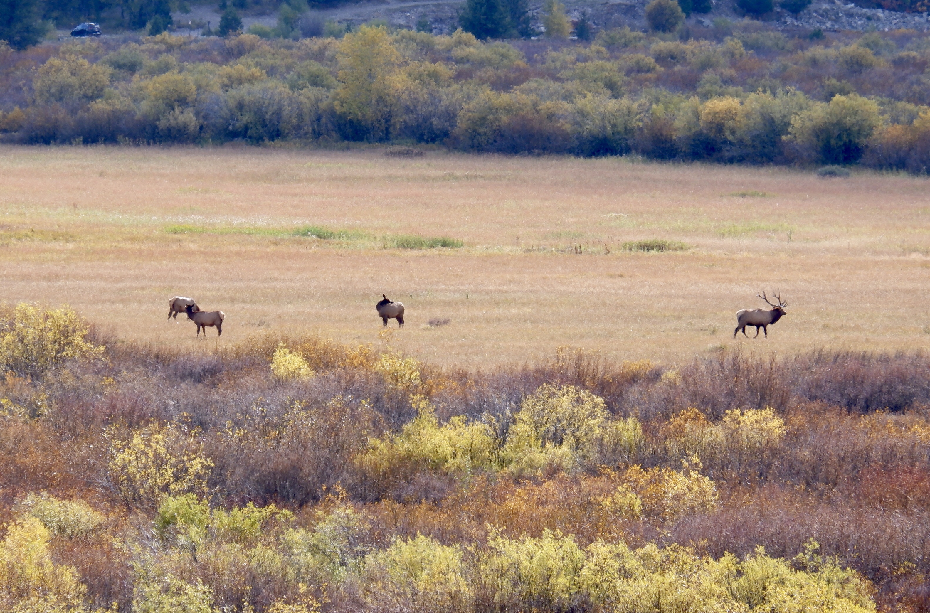 We’ve spent our time here walking the walking trails surrounding the vast wetland area, around the Emma Matilda Lake. The terrain is hilly and stoney. There are only a limited few paths crossing the wetland itself, only providing access to the hilly trails. But the scenery is breathtaking. Open wetlands are interspersed with pockets of pine trees and stands of Aspens. The Aspens have already yellowed and the leaves are beginning to redden. Our walks are about two hours each day. Back in our cottage, we sit out on the verandah in the warm sunshine, looking out at the mountains, with a cup of tea! Out on the distant wetland, we can see a small herd of Elk grazing. It is just too far for our 230mm telephoto lens to make them more than the size of an insect. The more ardent nature watchers have far bigger lenses than we do.