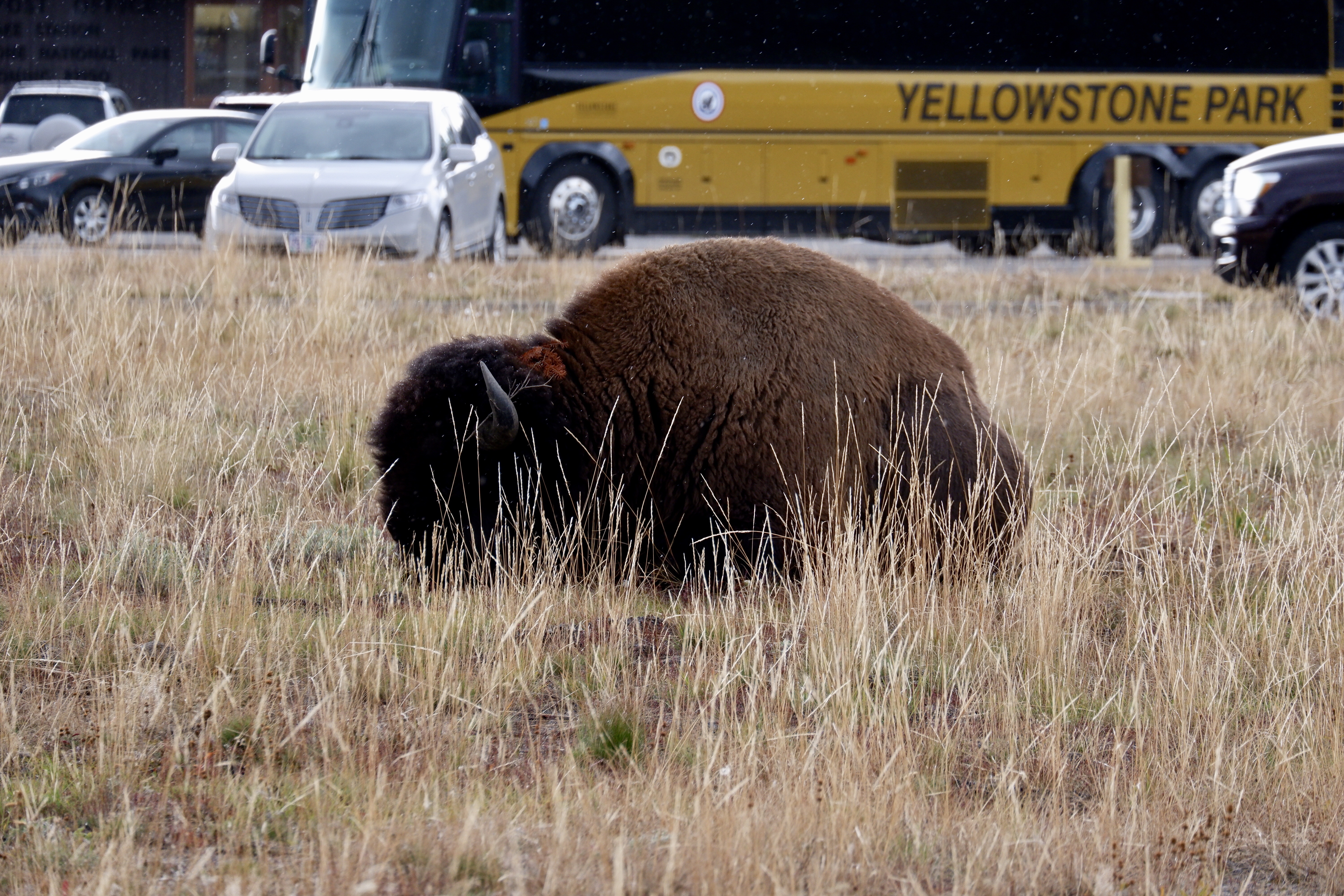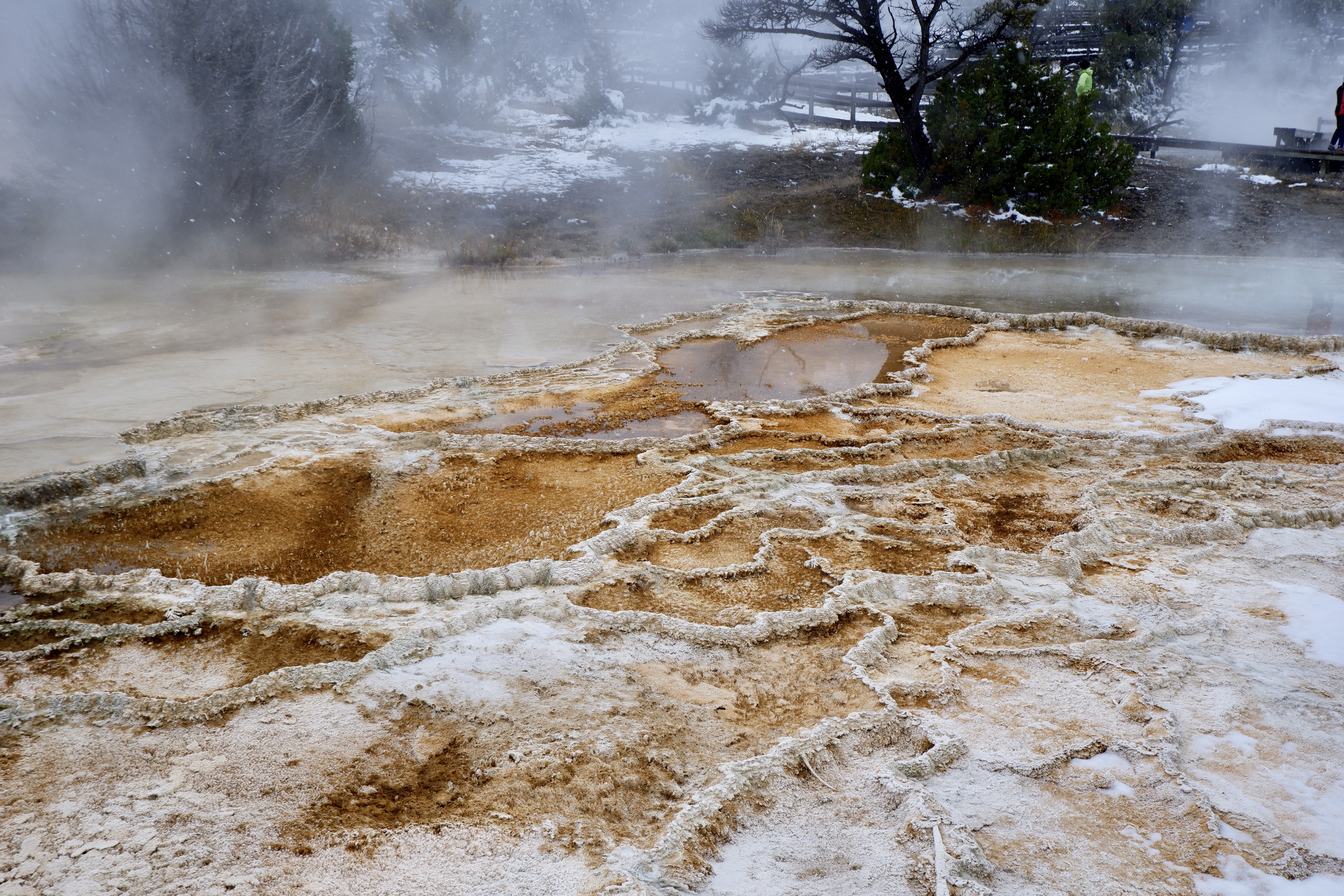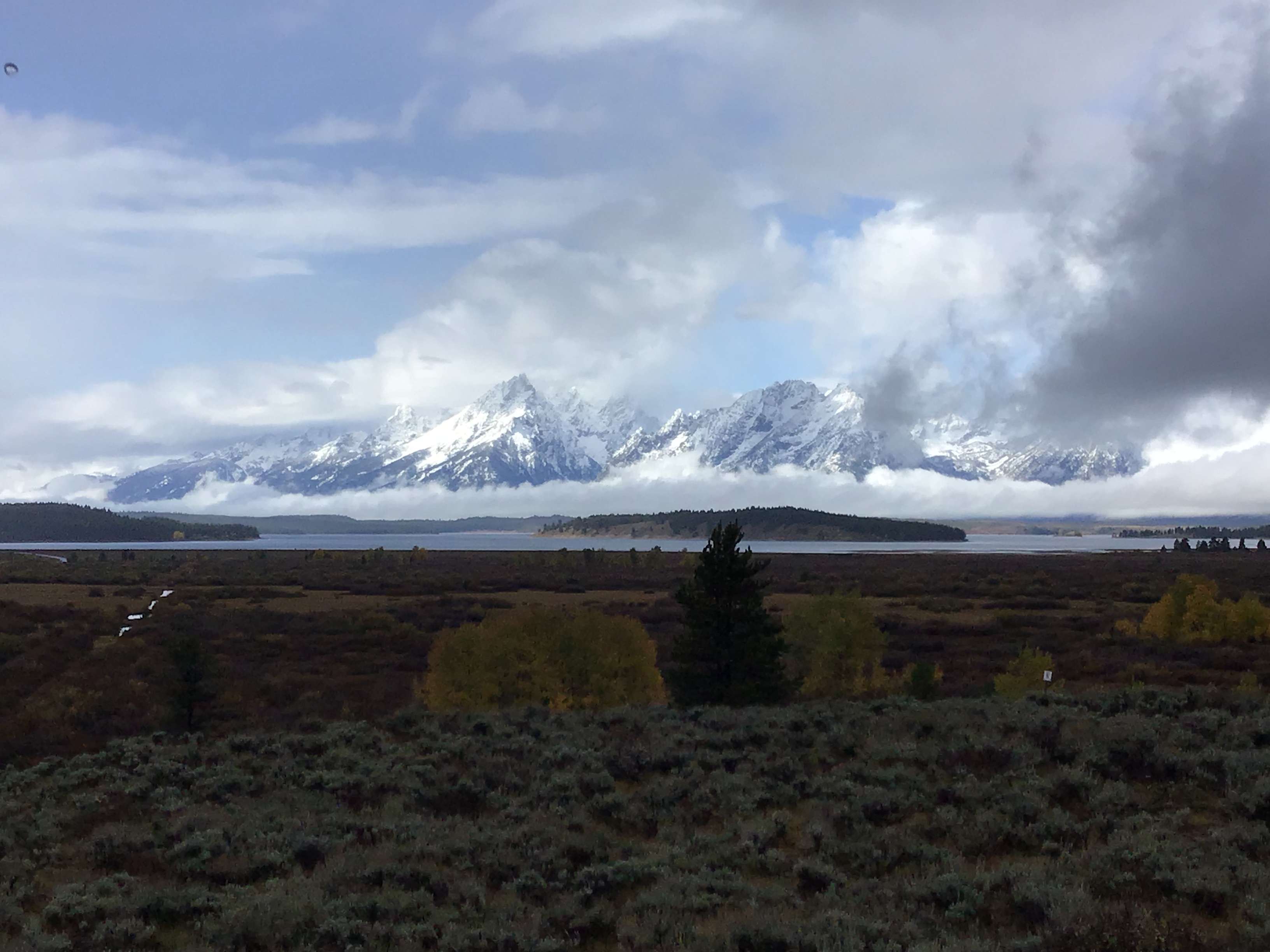 Back at the hotel after dark, we ate a light meal of charcuterie and a cheese platter in the Blue Heron Lounge, accompanied by a refreshing salad. Then, tired from the long day of walks and rafting, we retired to our warm cottage. The weather up to this point had provided warm, clear sunny days, chilling down noticeably in the evenings. The forecast was for snow (at least in Yellowstone), but we suspected we’d wake to rain next morning. But, to our surprise, we opened our curtains to see soft snow falling over the wetlands and the mountains hidden from view in the mist. We’ve been warned that the roads into Yellowstone could be closed without warning if the weather turns. That might prevent us getting in, or worse, see us being stranded in the park, unable to get out! Although everyone says the road clearing machines keep things open as far as it’s possible.