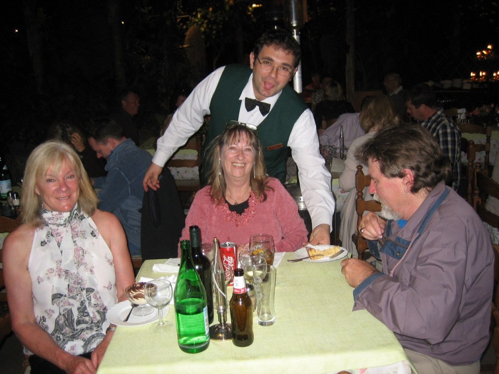 Our dinner that night was going to be our Anniversary celebration. So we ‘dressed’ for dinner and went up to the rooftop restaurant. It was a wonderful evening. We had just ordered a bottle of red wine when a waiter approached us with a bottle of Champagne (albeit a Mexican one) as a complimentary offering for our Anniversary. The meal was not a traditional Mexican meal, more of an Argentinian charcoal BBQ. We ordered the Arranchera, a grilled, seasoned skirt steak. Added to that, the salad buffet was much appreciated, given the lack of vegetables in the Mexican diet. Our waiter took some wonderful photos of us enjoying the spectacular evening vistas.