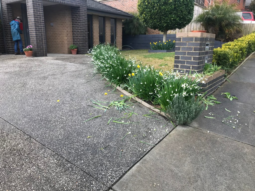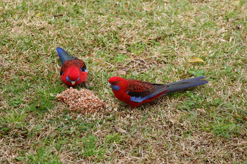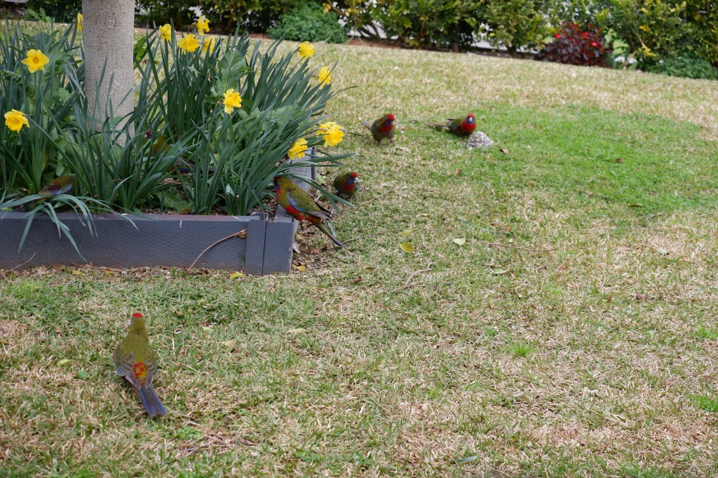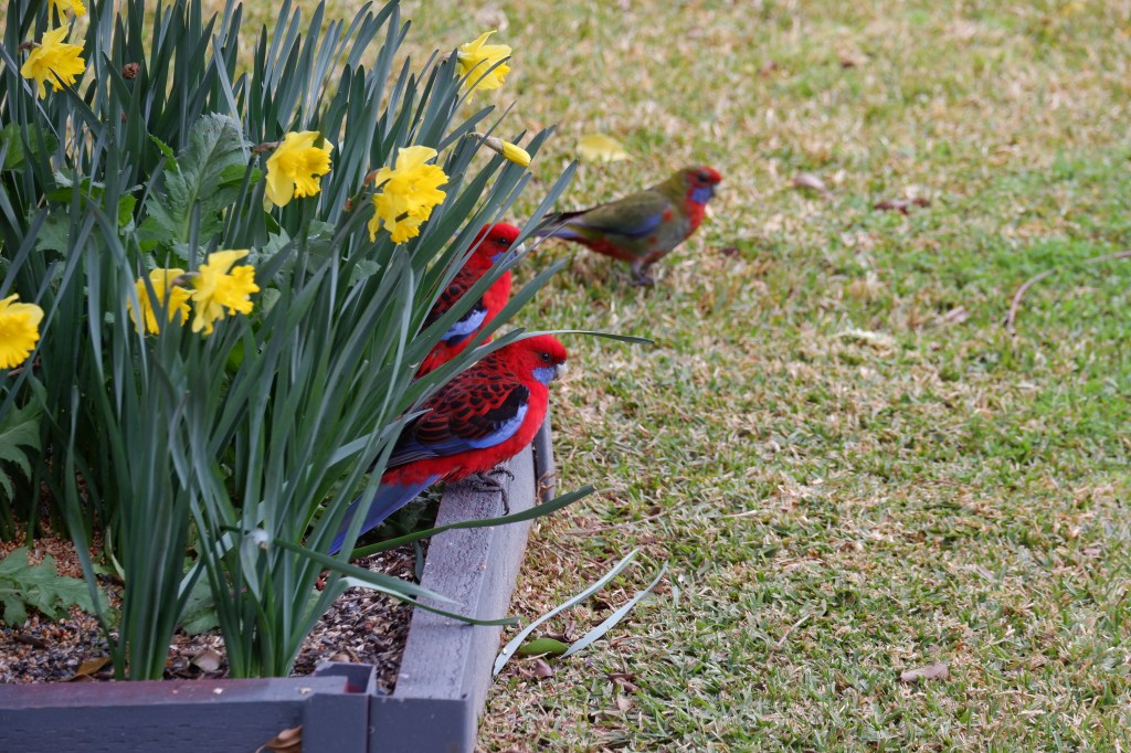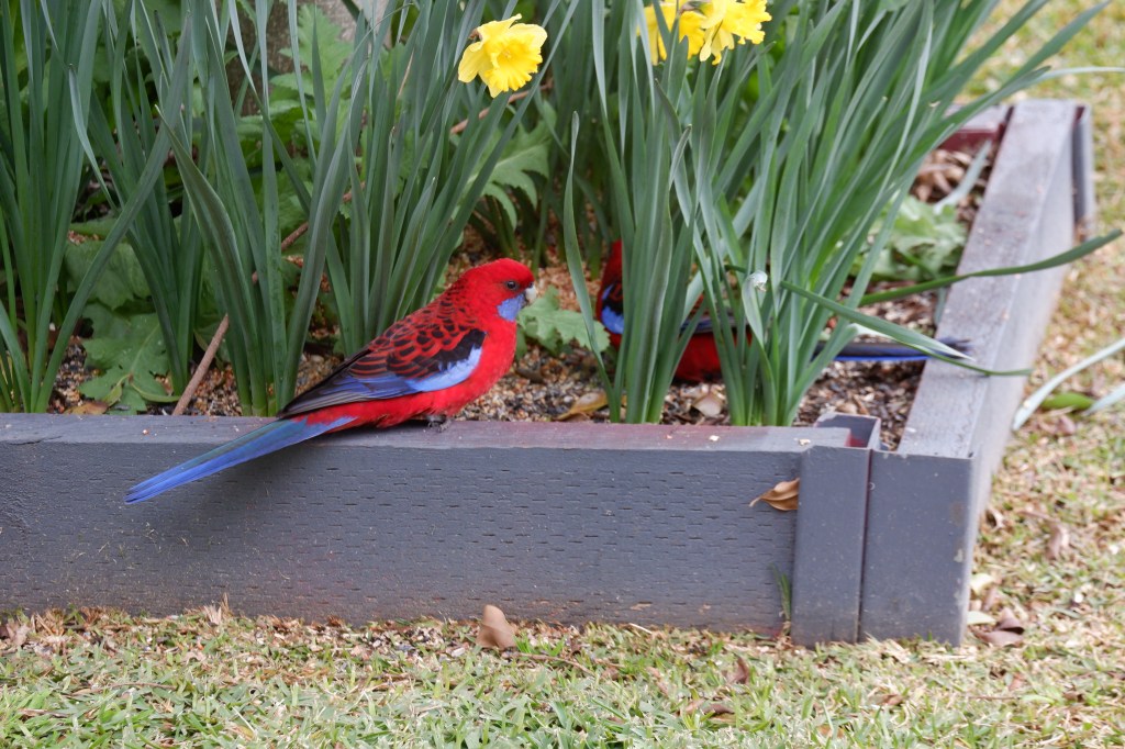 Our favourite bird is the Crimson Rosella, with its red head and body contrasting to the vibrant blue of its tail and the outer edges of its wings. The juvenile isn’t nearly so pretty with mottled red and green that gradually transforms into the splendid adult creature. A few years ago we started luring a pair into our front garden in winter with seed blocks. We were gratified when they returned, season after season. Then this year, something changed. More birds arrived, sometimes they shared the seed block cooperatively, with one adult bird sitting on our roof guttering waiting patiently until bird number one flew to a tree across the road along with its juvenile. The next adult would start munching on the block while it’s juvenile foraged on the surplus seeds that had dropped into the daffodils beneath.