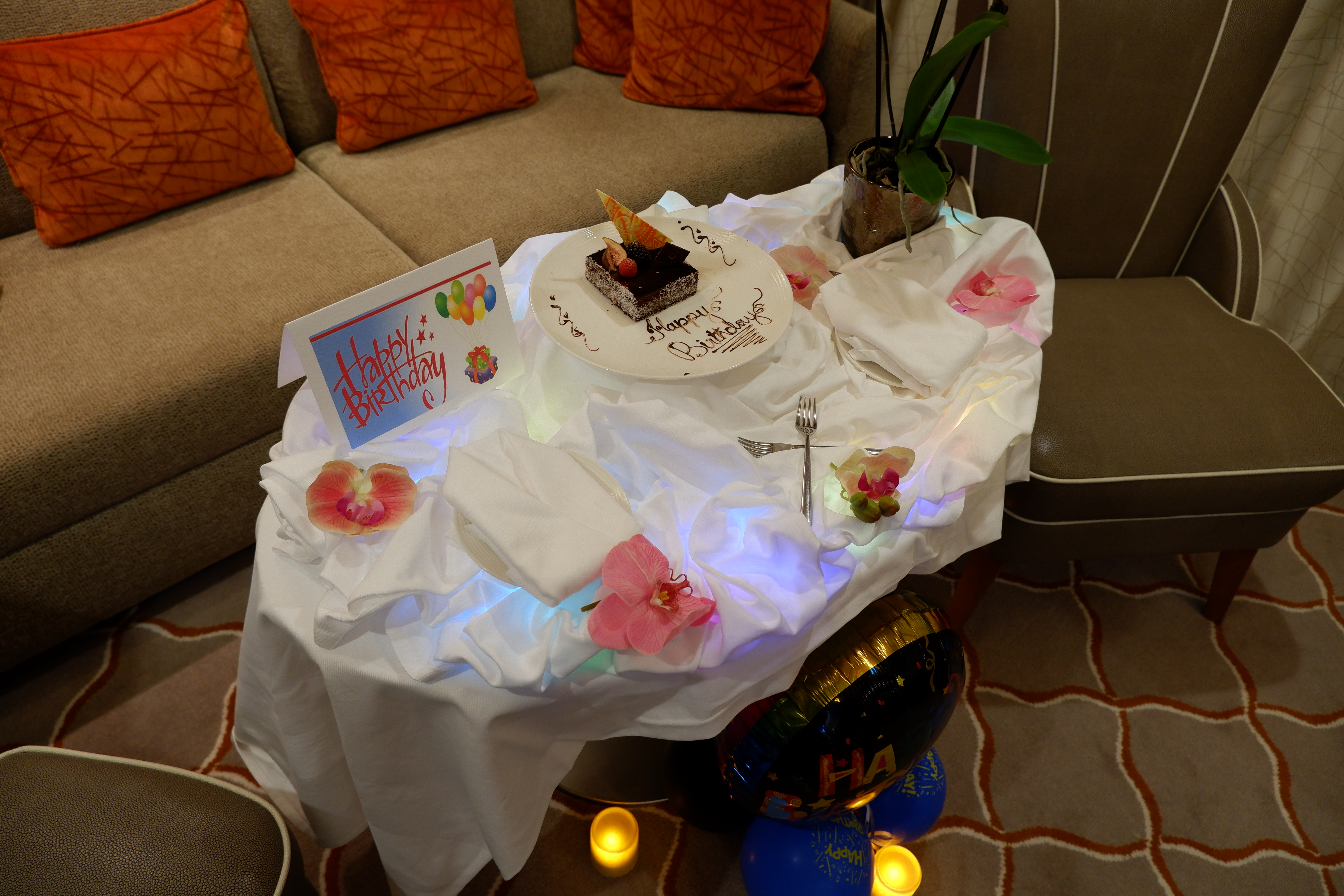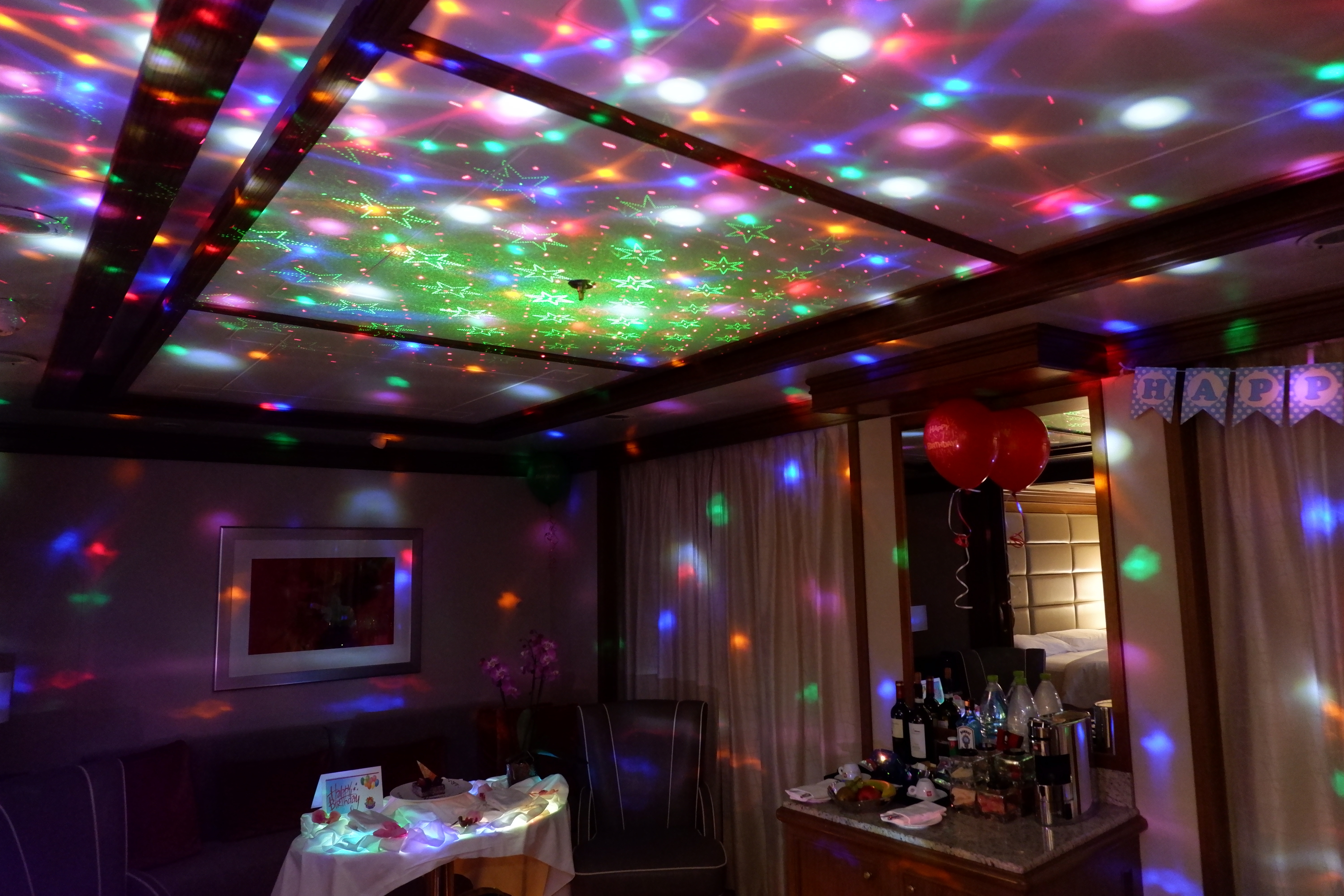 We came back to the ship completely exhausted and took a short ‘nana nap’ before dinner at The Silver Note. On our return to our suite, the canin staff had organised a surprise for Barry. The room of our cabin flickered with disco lights, ‘Happy Birthday’ and ‘Silver Threads Amongst the Gold’ boomed from a hidden recording, balloons and fairy lights were every-where, and of course, there was also cake!