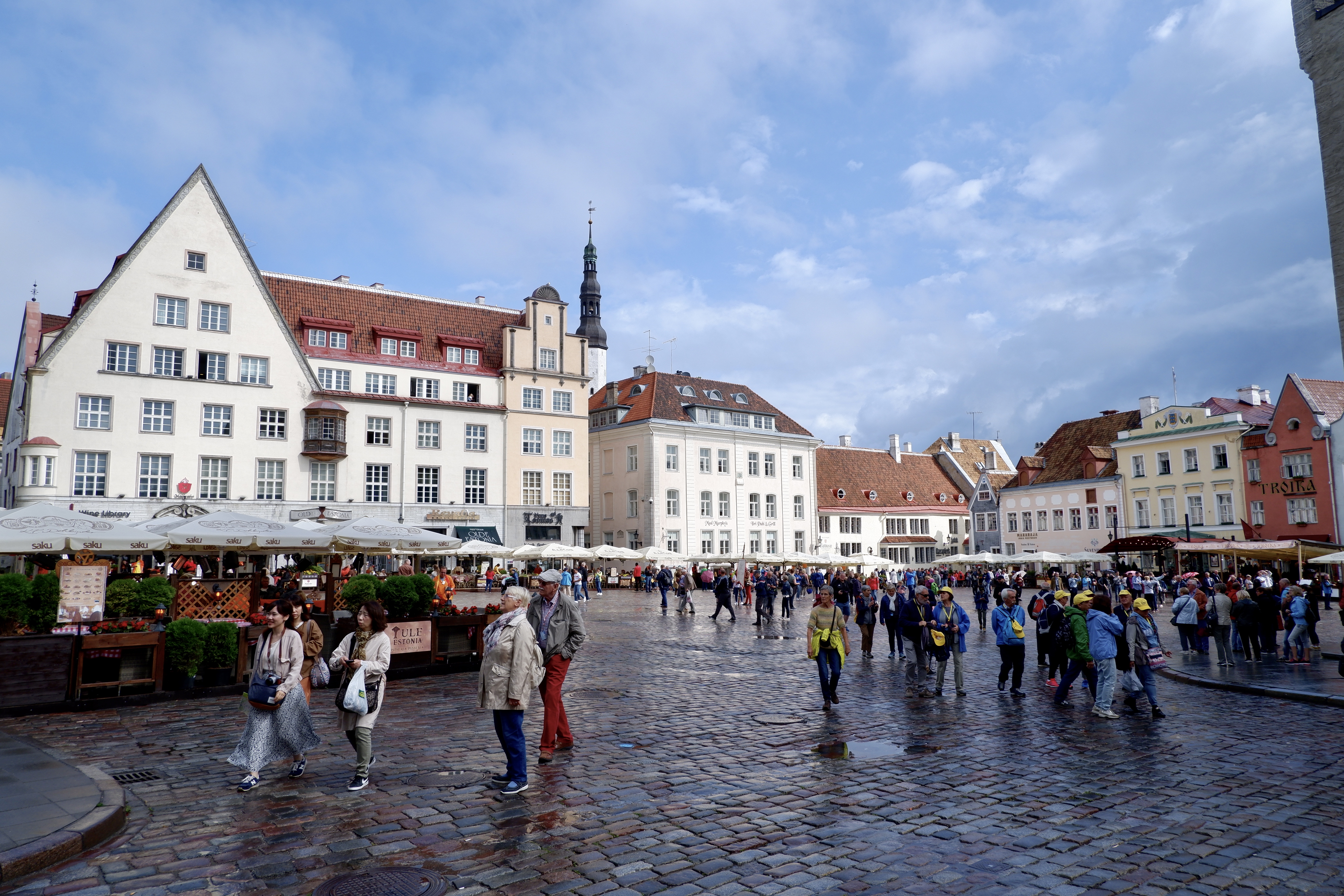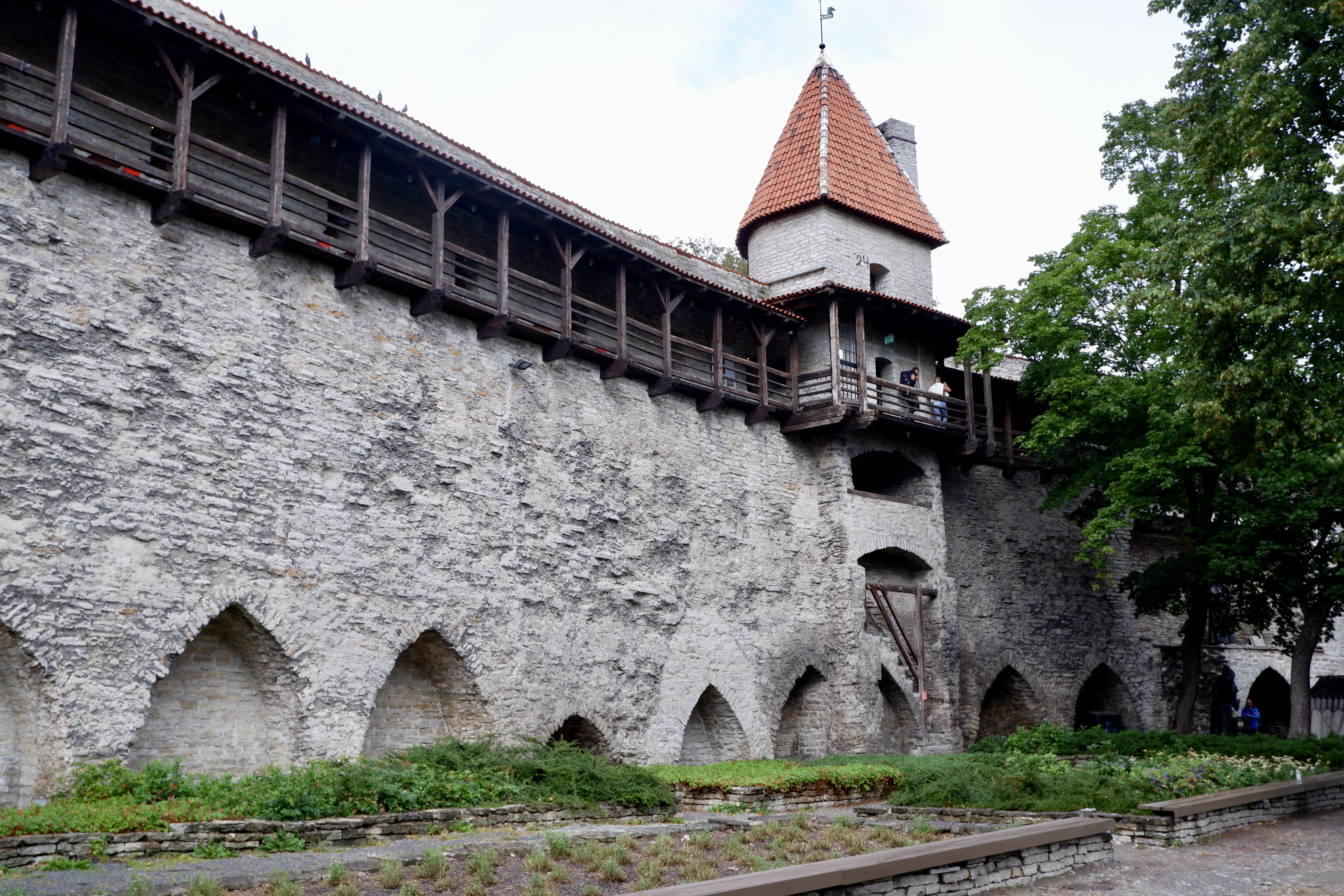 It was only going to be a short stop of less than seven hours. The ship was due to depart at 4 pm with everyone to be back on board by 3.30 pm. Unfortunately the forecast was for rain. But the skies looked like it would clear up as the morning wore on. Nevertheless, we ventured out wearing our rain parkas. A shuttle bus service operated to ferry us into near the old town centre. It was still overcast as we left the bus and walked the 800 metres to the old town gates. Tallinn’s old town has been described as an incredibly well preserved medieval city. It is ‘surrounded’ in parts by remnants of a wall that once would have completely enclosed the town. The wall was topped, in those remaining parts, by a wooden roofed parapet and walkway. While reflecting its ancient origins, much of it is obviously reconstruction.
