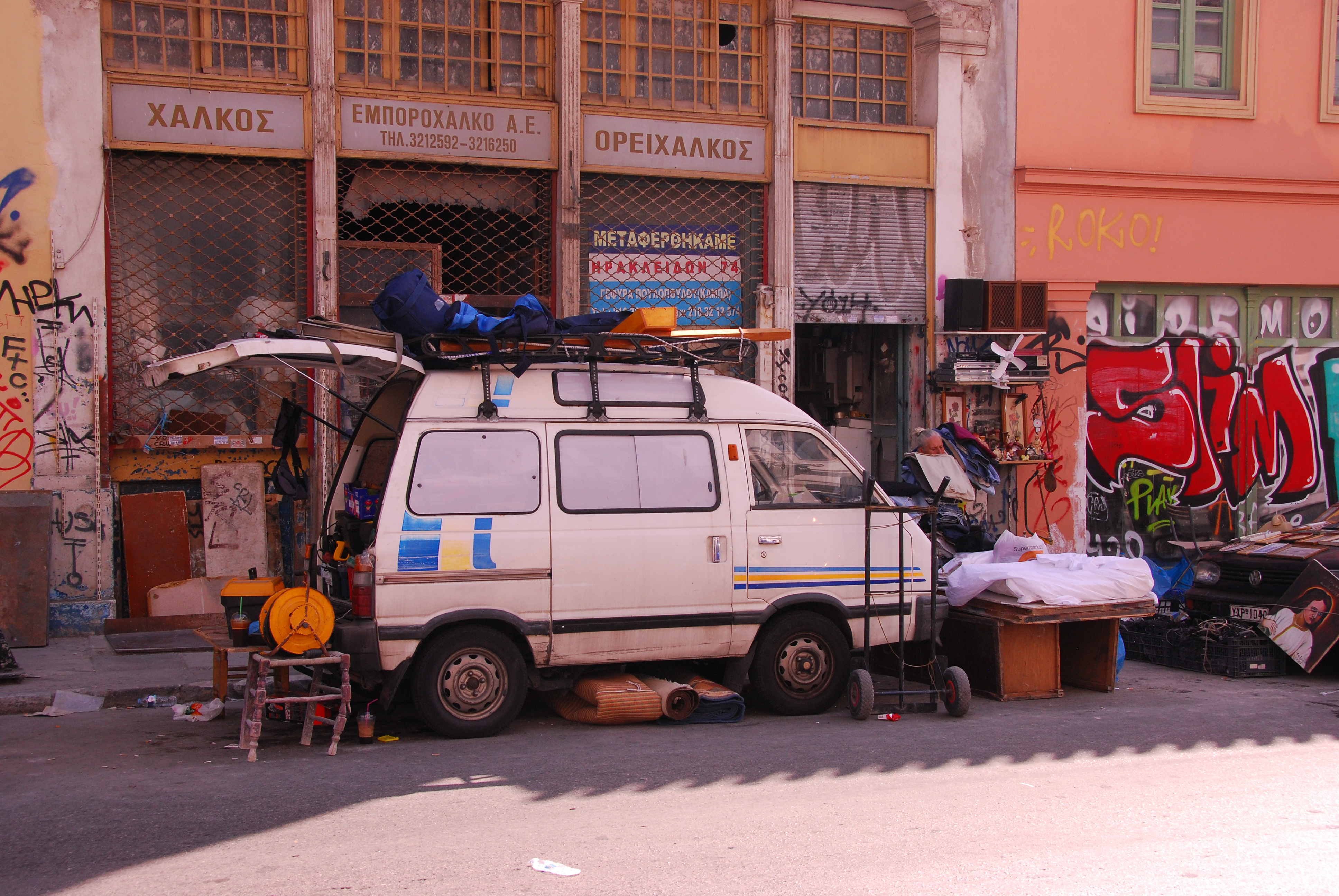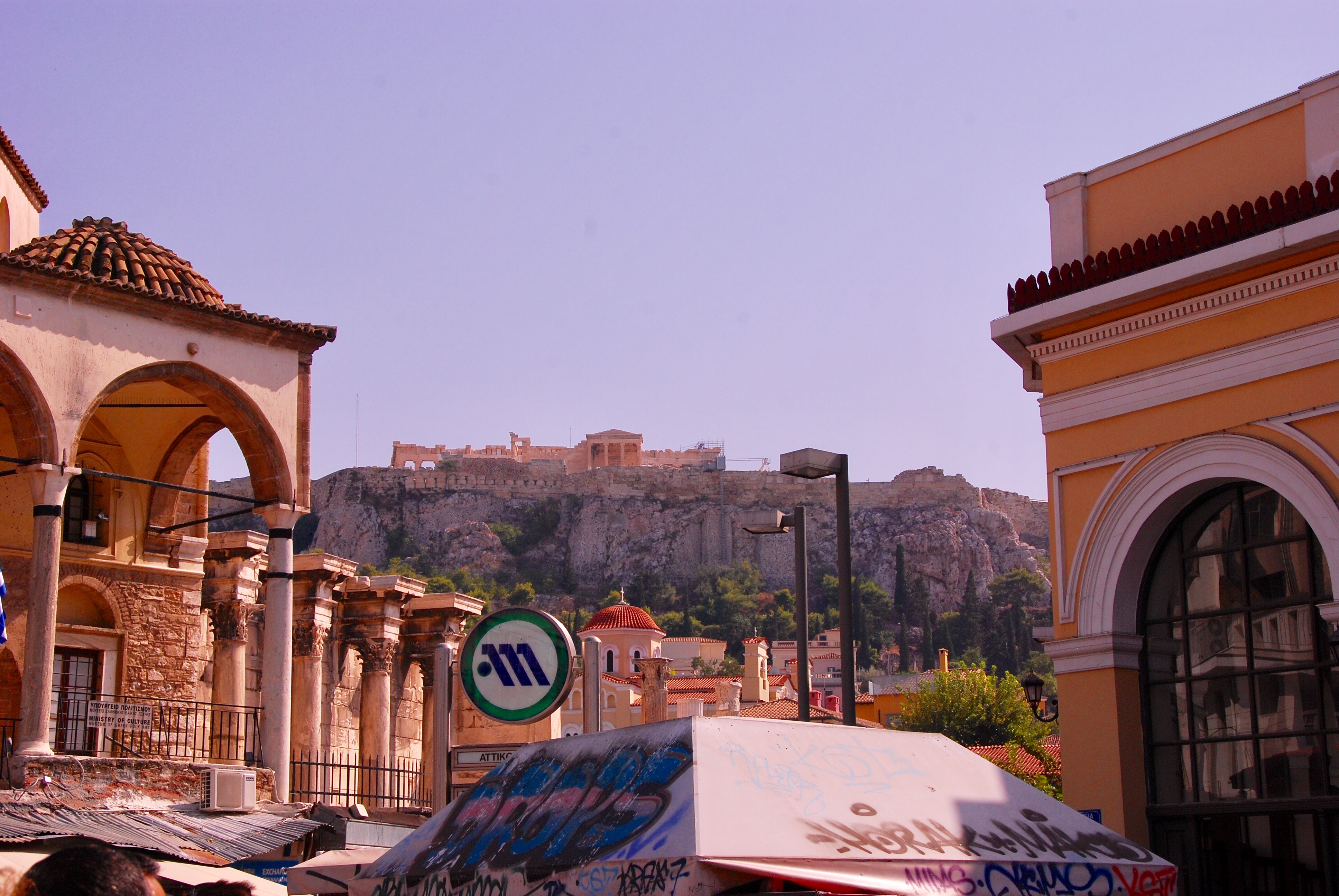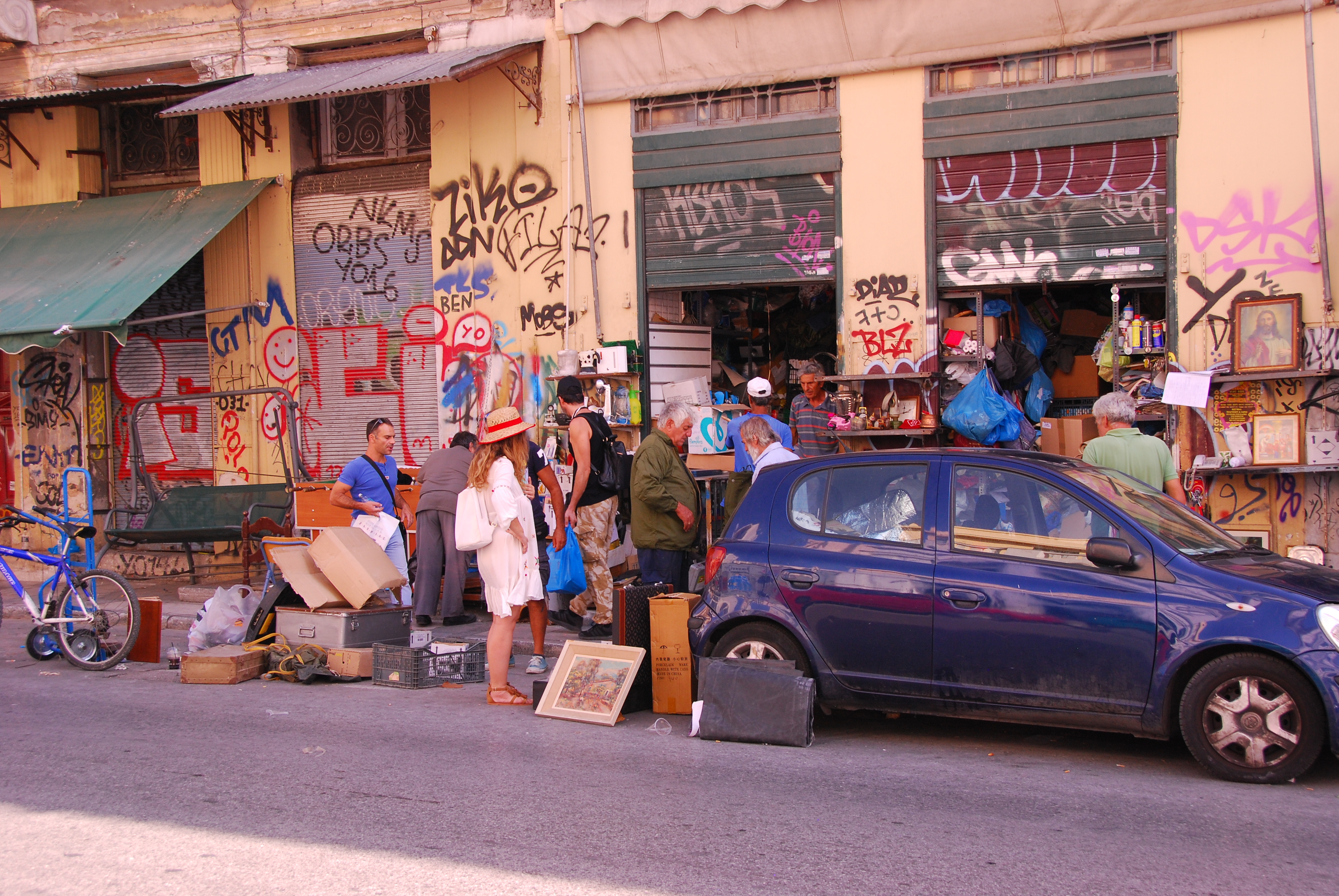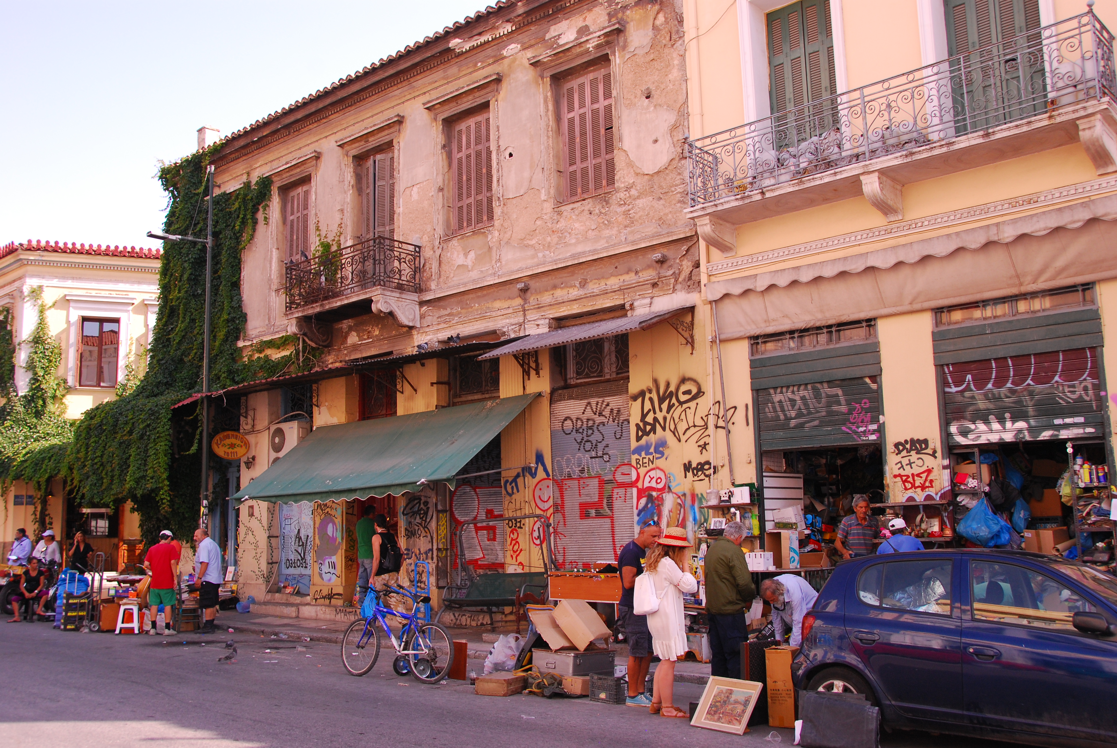 I was surprised to find Athens looking so down at heel. Although we stayed in a very nice hotel, the surrounding buildings were very run down and covered in graffiti. People were sitting on the footpath selling odd assortments of objects – a few forks, some uninteresting looking tools, old prints, books, broken lamps and what looked to be simply whatever they had around that they might (although it seemed unlikely to me) make some money from.