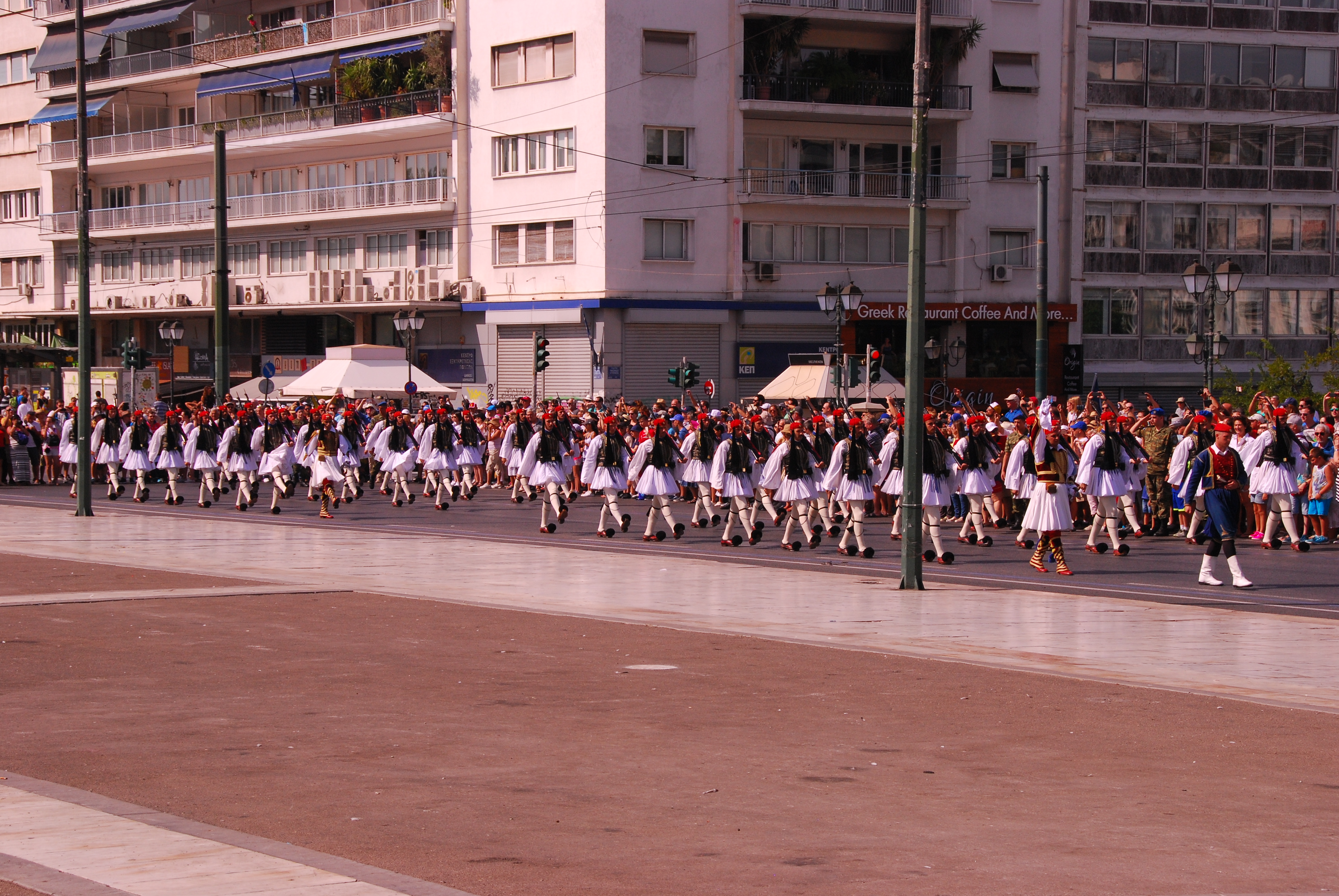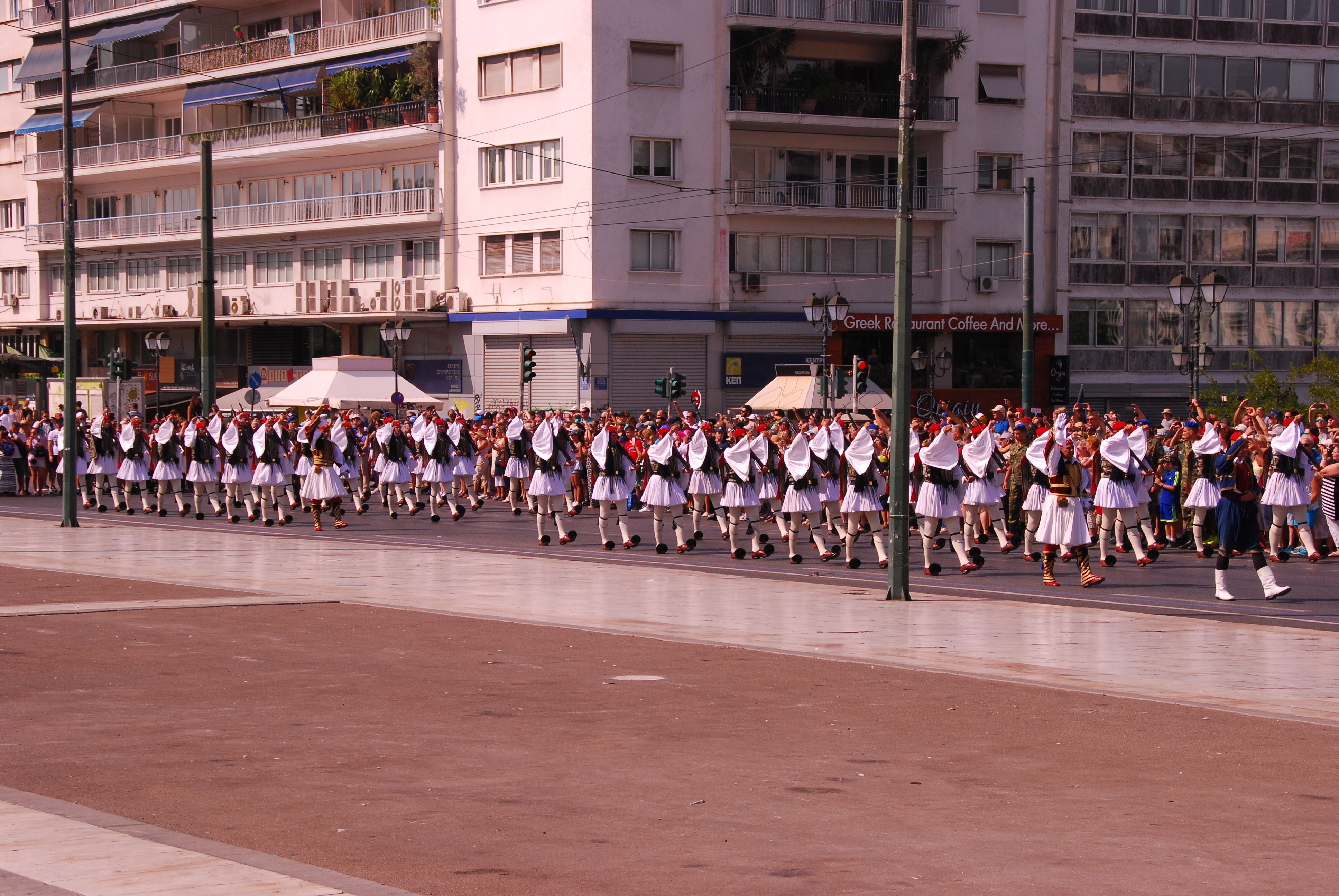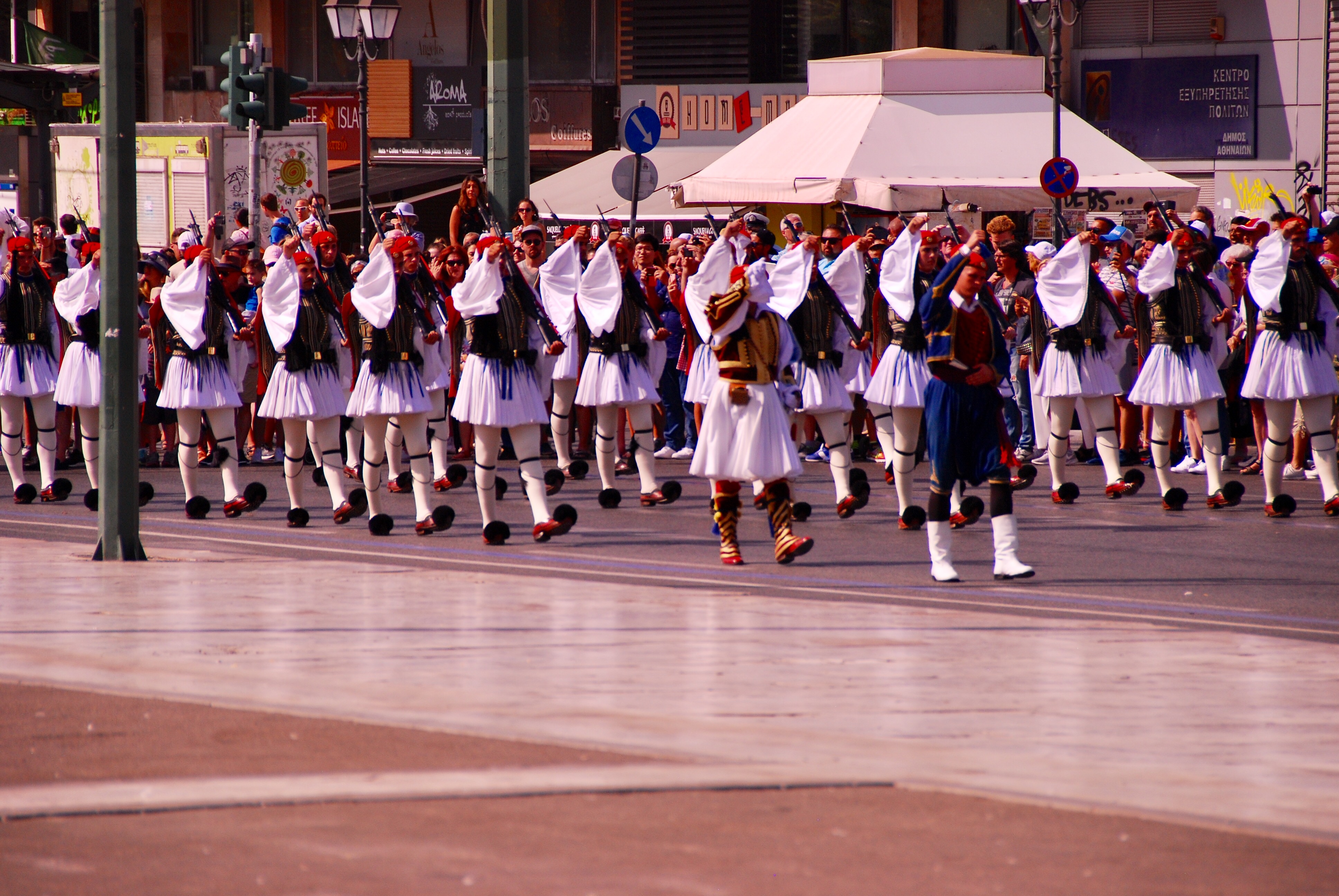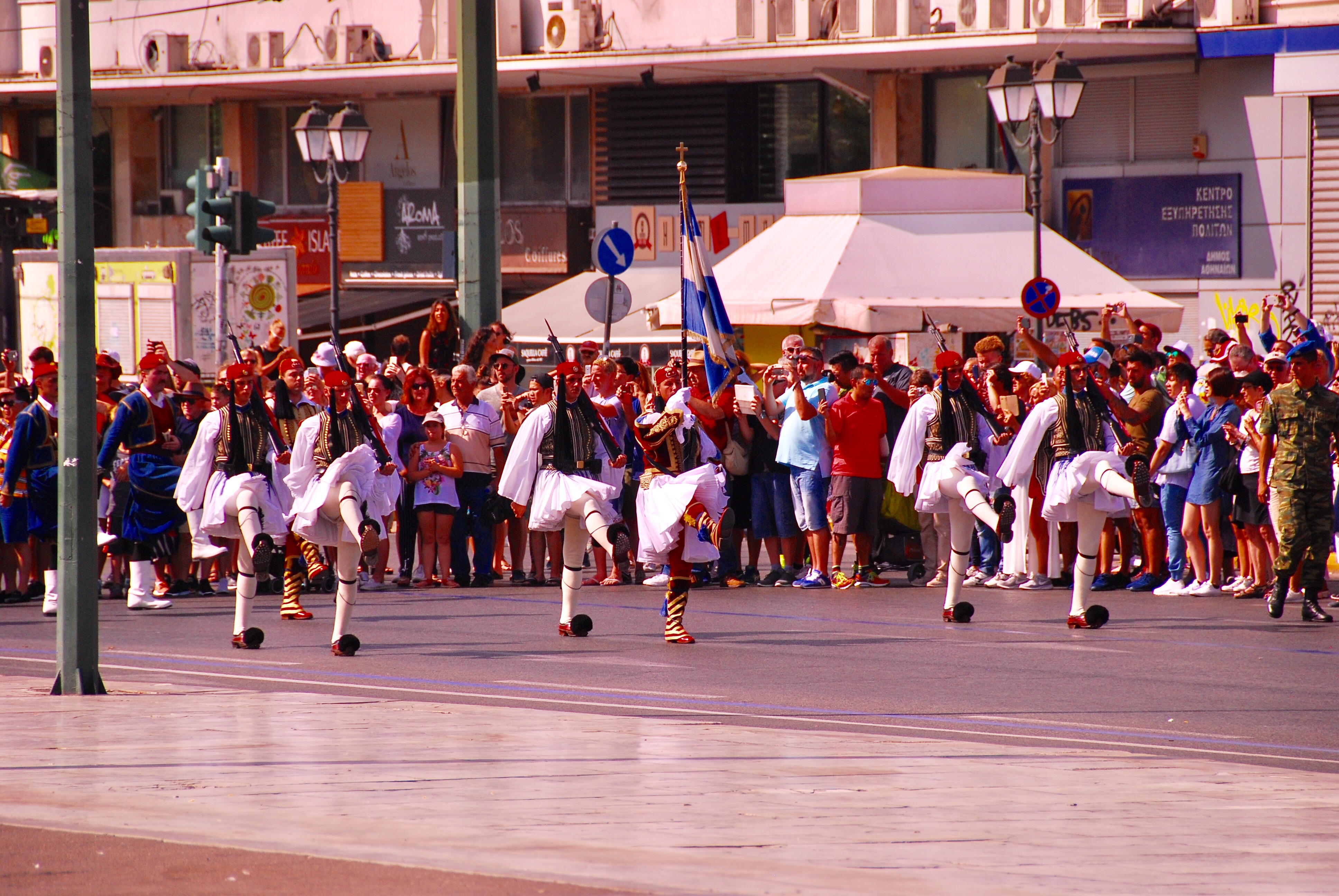 Every day on the hour, there is a Changing of the Guard ceremony by the ‘Evzones’, the elite Greek Guards who guard the grave of the Unknown Soldier outside the Hellenic Parliament in Syntagma Square. The soldiers are selected according to their height (they must be over six foot three), physical condition and character. Their complete traditional uniform is only worn for the Sunday 11 am Changing of the Guard ceremony, when rather than just a few soldiers, the entire battalion parade in full ceremonial dress.
